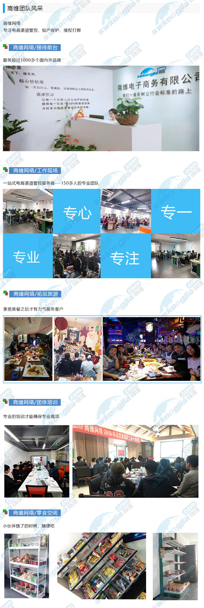 商维控价是一家专注电商服务(电商打假、维权、渠道管控)、知产保护(商标、专利、版权注册)、法律诉讼的综合性服务公司。 公司下设:黄山运营中心、杭州运营中心、合肥运营中心、蚌埠运营中心、滁州运营中心、芜湖运营中心。成立以来,公司先后服务了超过2000多家国内外品牌商。 商维愿景“商天下、维无界”,既诠释了做天下人生意的使命,又展示了服务无界限的自信;商维人会始终秉承这一初心,帮助品牌商实现线上市场的健康发展。 公司通过跟高校合作联合研发出多款软件,包括,电商盗图比对系统、电商侵权采集系统、电商监控通知系统、实时监控定时反馈系统等。有效的提高控价处理体系,快速监控并清除侵权的商品链接,全方位保护品牌价值 |